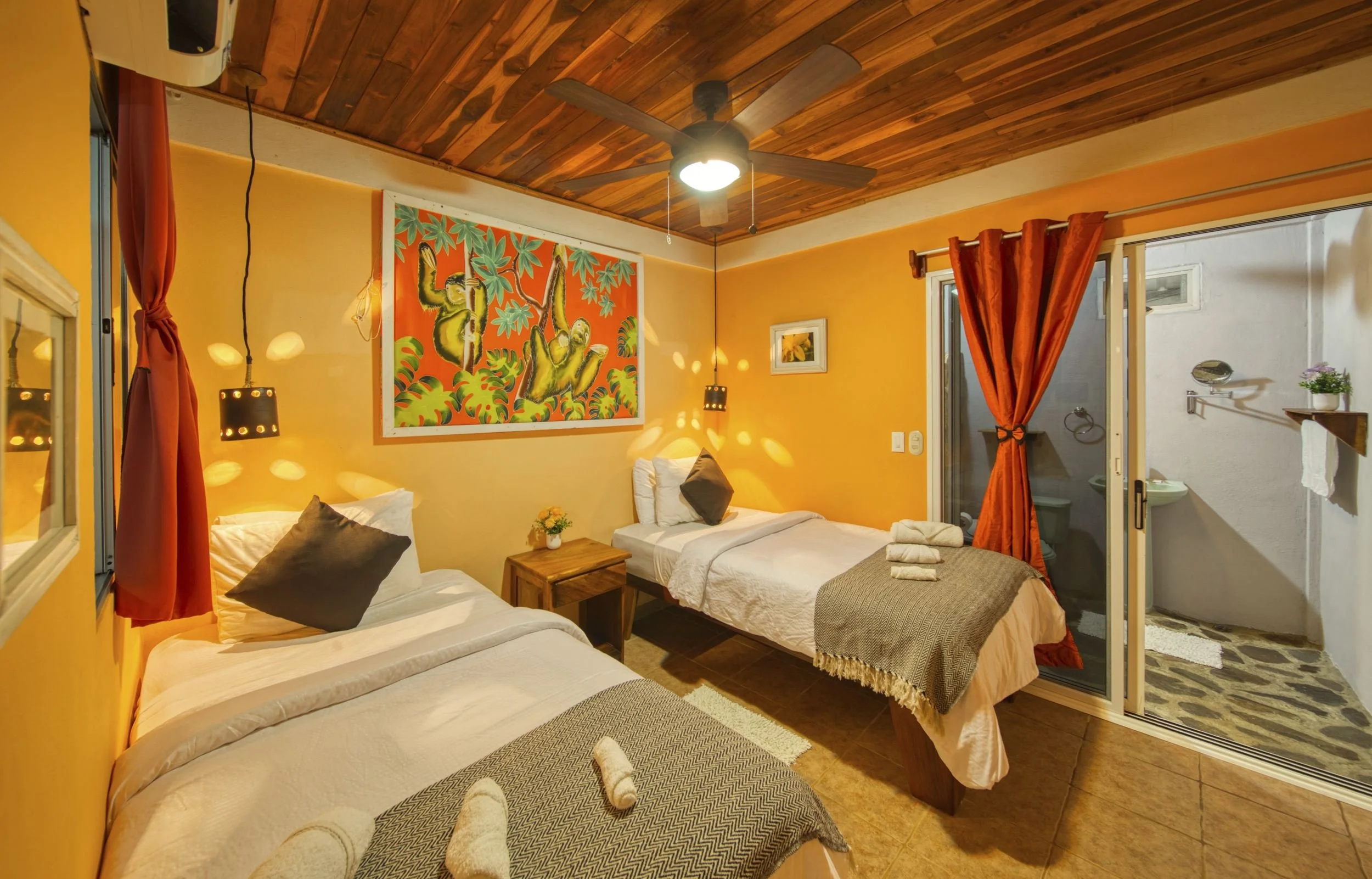 Comfortable room with a queen bed, single beds, A/C, and a private bathroom surrounded by lush flora and banana trees. Ideal for small groups or those on a budget, with access to our spacious communal kitchen.