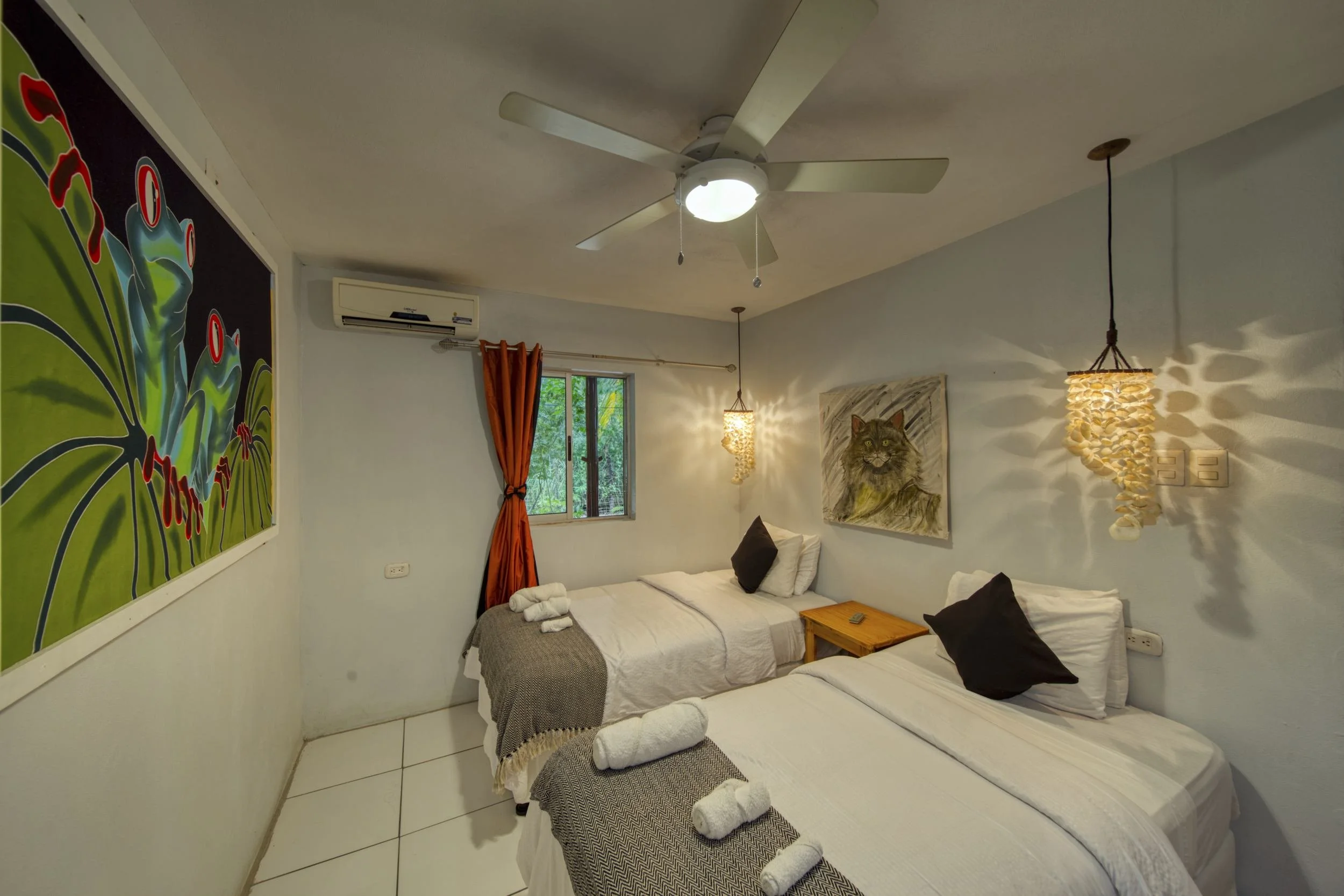 Comfortable room with a queen bed, single beds, A/C, and a private bathroom surrounded by lush flora and banana trees. Ideal for small groups or those on a budget, with access to our spacious communal kitchen.